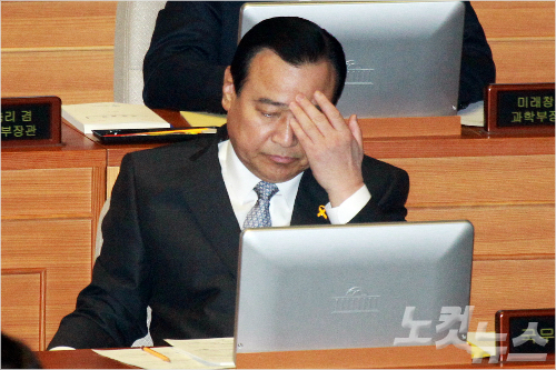 성완종 전 경남기업 회장으로부터 지난 2013년 국회의원 재선거 당시 3천만 원을 받은 의혹을 받고 있는 이완구 국무총리가 15일 오전 국회 본회의 경제 분야 대정부질문에서 손을 얼굴을 만지며 생각에 잠겨있다. 윤창원기자