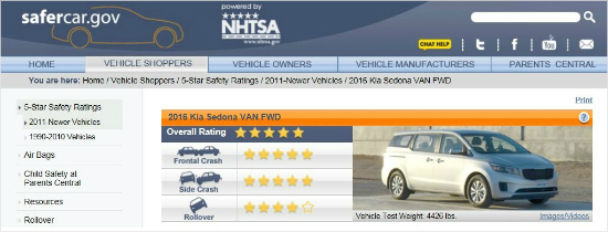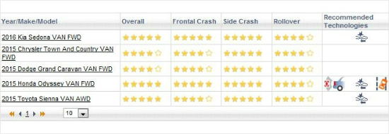 미국 주요 미니밴 NHTSA 안전도 테스트 결과 (미국 도로교통안전국(NHTSA ) 안전도 테스트 평가 홈페이지 캡처)