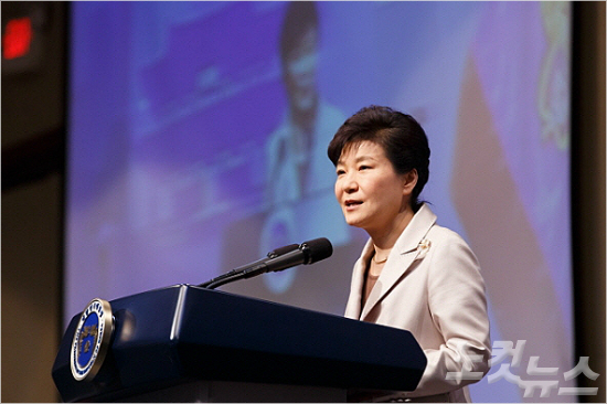 박근혜 대통령이 17일 오후(현지시간) 콜롬비아 보코타 께사다 컨벤션 센터에서 열린 한-콜롬비아 비즈니스 포럼에서 축사를 하고 있다. (청와대 제공)