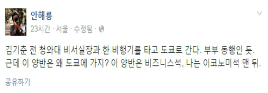 다큐멘터리 저널리스트인 안해룡 씨는 19일 페이스북에 "김기춘 전 청와대 비서실장과 한 비행기를 타고 도쿄로 간다, 부부 동행인 듯. 근데 이 양반은 왜 도쿄에 가지"라는 글을 올렸다{RELNEWS:right}