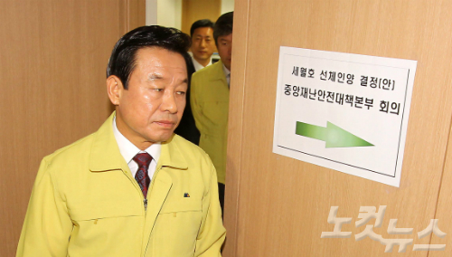 국민안전처 박인용 장관이 22일 오전 서울 종로구 정부서울청사에서 열린 세월호 선체인양 결정안 심의를 위한 회의에 참석하고 있다. (사진=박종민 기자)