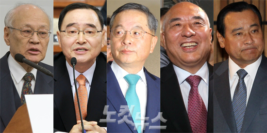 박근혜 정부 총리 후보 혹은 총리였던 5인, 왼쪽부터 김용준 박근혜대통령 인수위원회 위원장, 정홍원 전 국무총리, 안대희 대법관, 문창근 전 중앙일보 주필, 이완구 국무총리 (자료사진)