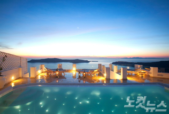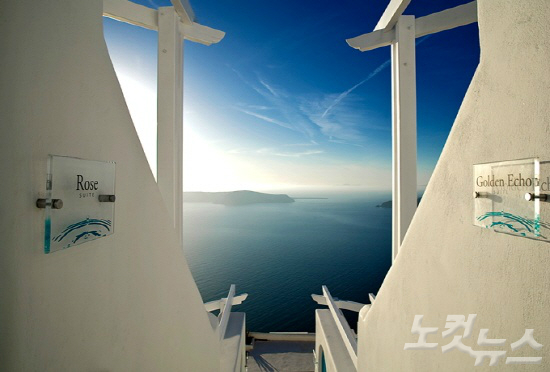 호텔 테라스에 앉으면 절벽 위로 옹기종기 모여 있는 이아 마을이 바로 보이는데, 특히 지중해 위로 사라지는 낙조와 함께 이아마을을 감상하면, 그림 같은 풍경을 한 눈에 담을 수 있다.