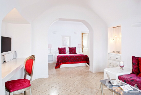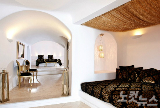 객실 내부는 마치 동굴에 들어선 듯 독특한 분위기를 자아내며, 창밖으로는 잔잔하게 흐르는 지중해의 풍광이 한 눈에 들어온다.