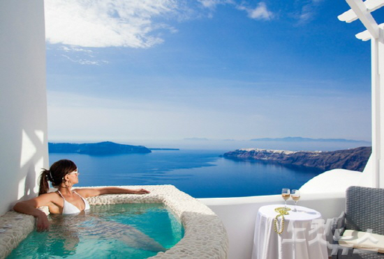 야외에 비치된 자쿠지는 하루 종일 따뜻한 온수가 채워져 있어 반신욕을 즐기며 산토리니의 풍경을 감상할 수 있다. 게다가 밤이 깊으면 자쿠지 욕조 안의 조명이 밝혀져 보다 로맨틱한 분위기가 연출된다.