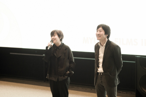 지난 27일 명필름 아트센터에서 열린 '명필름 영화학교 입학설명회'에서 명필름 심재명 대표(왼쪽)와 이은 대표가 인사말을 하고 있다. (사진=명필름 제공)