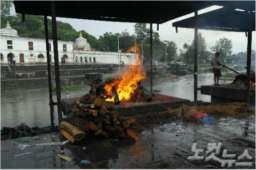 비가 내리던 28일 오후 대지진으로 가족을 잃은 네팔인들이 백향목과 짚더미로 피붙이를 화장하며 마지막 가는 길을 배웅하고 있다.(카트만두 = CBS노컷뉴스 박지환 특파원)