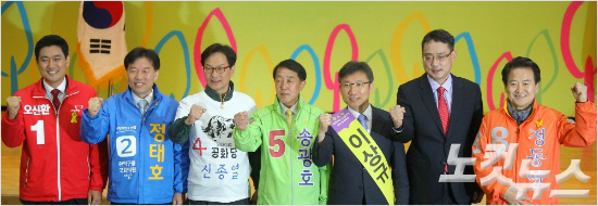 서울 관악구을 국회의원 선거에 출마한 후보. 왼쪽부터 새누리당 오신환, 새정치민주연합 정태호, 공화당 신종열, 무소속 송광호, 무소속 이상규(사퇴), 무소속 변희재, 무소속 정동영 후보. (박종민기자)