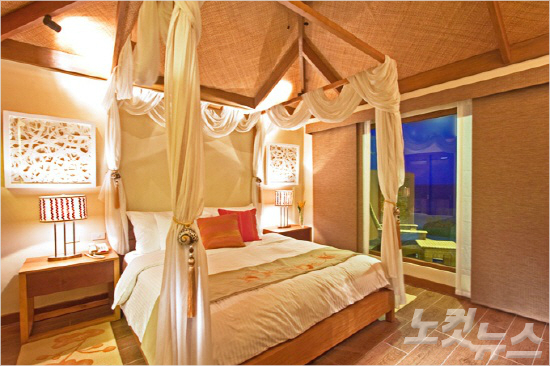 35평 규모의 풀빌라는 로맨틱한 캐노피가 장식된 킹 사이즈 베드와 여유롭게 물놀이를 즐길 수 있는 개인풀장, 오픈형 욕실, 전신에 힐링을 전달하는 레인 샤워기 등 고객의 편의를 위한 모든 것이 마련됐다.