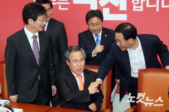 공무원연금개혁 논의를 위해 29일 국회에서 여야 원내대표, 정책위의장 등이 참석한 4+4회동이 열린 가운데 주호영 공무원연금개혁특위 위원장이 새정치민주연합 우윤근 원내대표와 인사를 하고 있다.