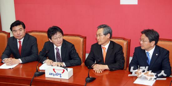 공무원연금개혁 논의를 위해 29일 국회에서 열린 여야 4+4회동에서 새누리당 유승민 원내대표가 모두발언을 하고 있다.(좌측부터 새누리당 원유철 정책위의장, 유승민 원내대표, 새정치민주연합 우윤근 원내대표, 강기정 정책위의장)