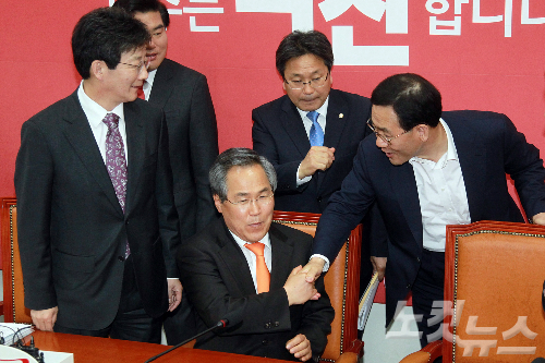 공무원연금개혁 논의를 위해 29일 국회에서 여야 원내대표, 정책위의장 등이 참석한 4 4회동이 열린 가운데 주호영 공무원연금개혁특위 위원장이 새정치민주연합 우윤근 원내대표와 인사를 하고 있다. 윤창원기자