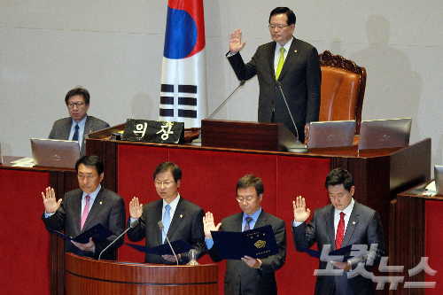 4.29재보선에서 당선된 (좌측부터)새누리당 안상수(인천서구강화을), 무소속 천정배(광주 서구을), 새누리당 신상진(성남중원), 오신환(서울관악을) 의원이 30일 오후 국회 본회의에서 의원선서를 하고 있다. (사진=윤창원 기자)