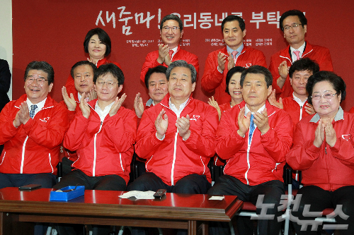 새누리당 김무성 대표, 유승민 원내대표 등 당 지도부가 29일 저녁 여의도 당사에서 4.29재보선 개표방송을 지켜보며 출마후보들의 당선이 확실시 되자 박수를 치고 있다. (사진=윤창원 기자)