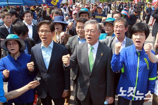 근로자의날인 1일 오후 여의도 문화마당에서 한국노총 주최로 열린 '노동시장 구조개악 저지 및 생존권 사수를 위한 전국노동자대회'에 새정치민주연합 문재인 대표와 새누리당 김문수 보수혁신위원장이 노동가를 부르고 있다.