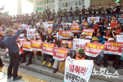 공무원노조 조합원들이 1일 오후 국회 본청 앞 계단에서 정부와 여당의 공무원연금 개혁에 반대하는 기습시위를 벌이고 있다. (사진=윤창원 기자/자료사진)