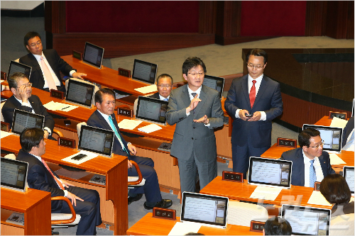 새누리당 유승민 원내대표가 6일 저녁 국회 본회의장에서 공무원연금 개혁안 여야 합의 불발을 발표하고 있다.