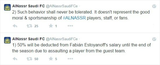에스토야노프의 돌발 행동이 유럽 언론을 통해 보도되는 등 빠르게 문제시되자 알 나스르 구단은 빠르게 대처했다. 에스토야노프의 임금을 50% 삭감한 알 나스르는 "어떤 상황에서도 상대 선수를 폭행하는 행동은 용납할 수 없다"고 공식 입장을 밝혔다.