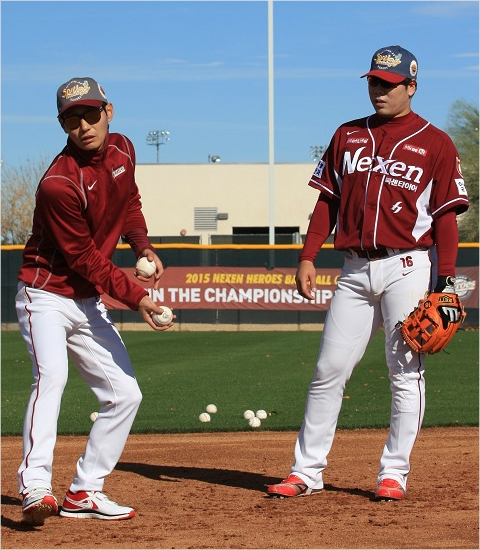 '정호야, 너 없어도 되겠다' 올해 미국 스프링캠프에서 염경엽 감독(왼쪽)이 피츠버그로 진출한 강정호에게 수비 지도를 하는 모습.(자료사진=넥센)