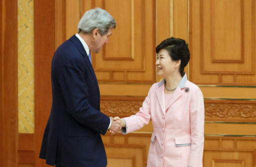 박근혜 대통령이 18일 오전 청와대에서 존 케리 미국 국무장관을 접견하며 악수하고 있다. (사진=청와대 제공)