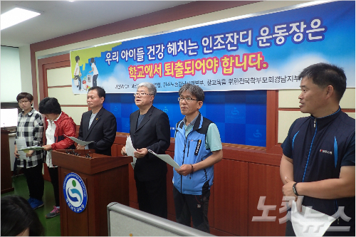 경남 지역 시민사회단체들이 유해물질이 검출된 인조잔디 운동장에 대한 전수조사와 철거를 촉구했다.