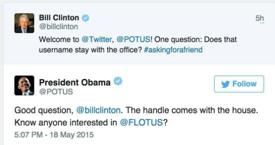 클린턴 전 대통령은 "@POTUS, 트위터 입성을 환영한다"면서 "한 가지 질문이 있다. @POTUS 아이디는 백악관에 남겨두고 가나?"라고 트윗을 날렸다. 대권에 도전하는 부인 힐러리 클린턴 전 국무장관을 염두에 둔 재치있는 질문이었다.