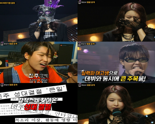 이날 가면을 벗자마자 눈물을 뚝뚝 흘린 진주는 “MBC에 정말 오랜만에 노래하러 왔다”고 말문을 열었다. 이어 “나를 보고 추억의 가수라고 하더라. 오랫동안 활동을 하지 않아서 잊혀져 있었고, 음악에 정체기가 있어 놓고 싶기도 했다”고 털어놨다.