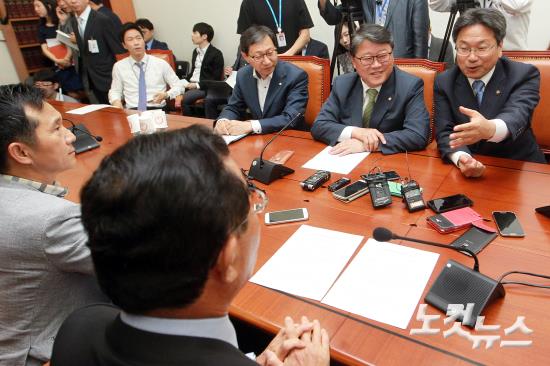 새누리당 조원진-새정치민주연합 강기정, 공무원연금개혁 특위 여야 간사가 26일 오전 국회 안전행정위원회 소회의실에서 공무원연금개혁 실무기구에 참여했던 연금 전문가 3인과 회동하고 있다.