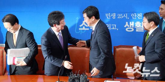 27일 오후 국회에서 열린 공무원연금개혁안 처리와 민생경제법안 처리 등을 위한 여야 원내지도부 및 공무원연금개혁특위 여야 간사 회동에서 새누리당 유승민 원내대표와 새정치민주연합 이종걸 원내대표가 비공개 논의를 위해 자리를 이동하고 있다.