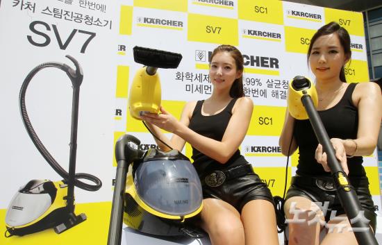 4일 오전 서울 용산역 광장에서 모델들이 독일 청소기 브랜드 '카처'의 스팀진공청소기 SV7과 핸디형 스팀청소기 SC1 프리미엄을 선보이고 있다. SV7 모델은 스팀 멸균기능에 4중 필터 시스템을 적용했으며, SC1 프리미엄은 일반 가정과 1인 가구에 최적화된 작고 강력한 보급형 휴대용 스팀청소기이다.
