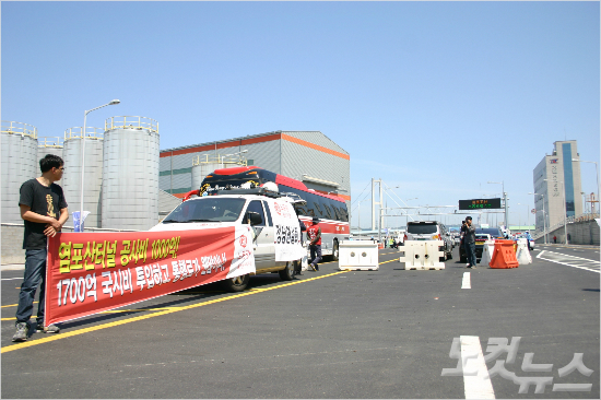 울산시와 민간 사업시행사 간의 울산대교 통행료 인하 합의는 염포산터널 무료화 문제를 물타기 하기 위한 것이라는 의혹이 제기되고 있다. 지난 달 29일 울산대교 준공식에서 노동당 울산시당이 염포산터널 무료화를 촉구하고 있다.