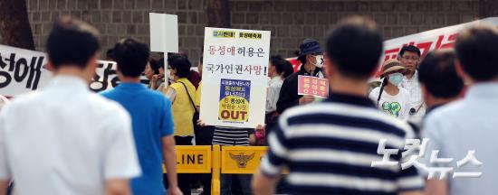 9일 오후 서울광장 맞은편 인도에서 건강과가정을위한학부모연합의 한 회원이 퀴어문화축제의 개막식을 앞두고 동성애를 규탄하며 1인 피켓시위를 하고 있다.