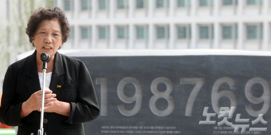 9일 오후 서울 신촌 연세대학교 한열동산에서 열린 ‘이한열 열사 기념비 제막식’ 에 참석한 고 이한열 열사 어머니 배은심 여사가 인사말을 하고 있다. 고 이한열 열사는 지난 1987년 6월 9일 전두환 군사정권 규탄 시위에서 경찰이 쏜 최루탄을 맞고 쓰려져 유명을 달리했다. (사진=황진환 기자)