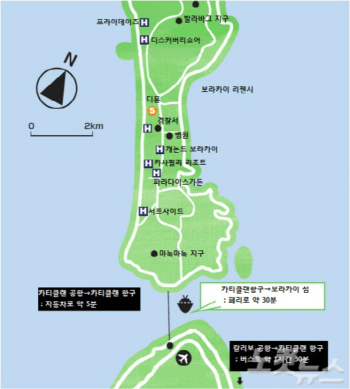 필리핀 국내선 이용 시에는 카티클랜 공항에서 카티클랜 항구까지 자동차로 약 5분, 카티클랜 항구에서 보라카이 섬까지 배로 약 30분이 소요된다.
