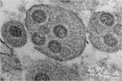 국내 메르스 바이러스의 전자현미경 16만배율 확대 모습 (사진=보건복지부 제공)