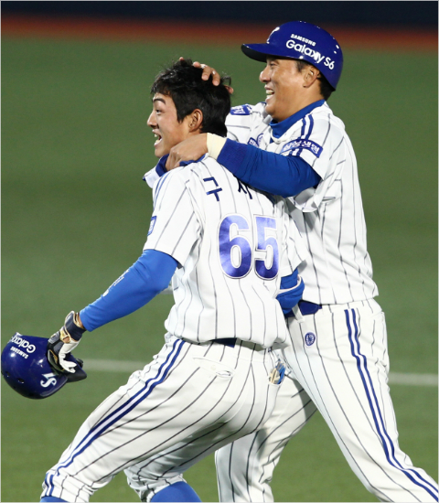 '삼성판 배트맨과 로빈?' 삼성 구자욱(65번)은 '리틀 이승엽'이라는 별명이 말해주듯 팀 간판 이승엽의 뒤를 이을 차세대 스타로 꼽힌다. 사진은 지난 4월 9일 롯데전에서 끝내기 안타를 때린 뒤 이승엽과 격하게 기뻐하는 모습.(자료사진=삼성)