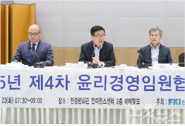 김은태 전경련 윤리경영임원협의회 신임의장이 개회사를하고있다. 사진 왼쪽부터 송동현 스트래티지샐러드 부사장, 김은태 윤리경영임원협의회 신임의장, 박찬호 전경련 전무