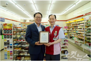 정승인 세븐일레븐 대표가 범죄 피해 여성을 구한 점주 나기열씨에게 포상하고 있다.