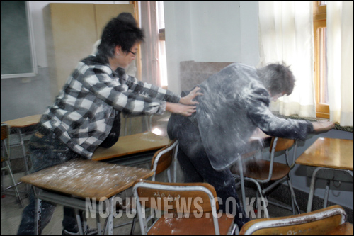 17일 오전 서울 한 고등학교 졸업식에서 학급 친구들끼리 밀가루를 뿌리며 졸업을 축하하고 있다. (한대욱기자/노컷뉴스)