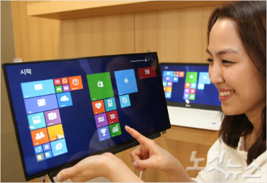 LG디스플레이 직원이 이번에 개발한 15.6인치 터치형 노트북용 풀HD LCD 제품을 시연하는 모습