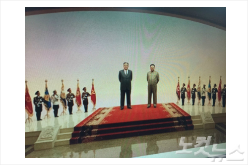 북한 조선중앙TV가 8일 김일성 주석 21주기를 맞아 김정은제1비서의 참배영상 보도에서 지난 해까지 흰색 석고상이었던 김일성·김정일 동상이 컬러 동상으로 바꾼 것으로 밝혀졌다.