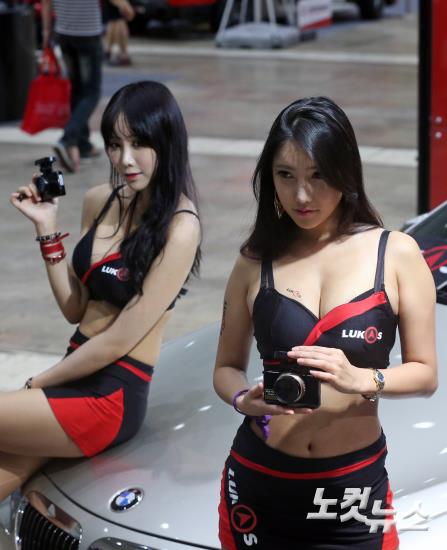 9일 오전 서울 강남구 코엑스에서 열린 대한민국 자동차 튜닝.애프터마켓 전문 전신회인 '2015 서울오토살롱'에서 레이싱 모델 윤체리와 김유아가 포즈를 취하고 있다.