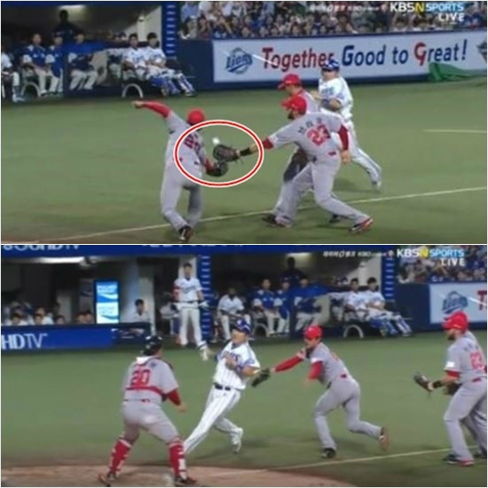 '모두 속아넘어갔던 장면' 9일 삼성-SK의 대구 경기 4회말 2사 2루 상황에서 나온 박석민의 내야 안타를 SK 1루수 브라운이 잡고 있는 장면(위)과 이후 홈으로 뛰어드는 삼성 최형우를 SK 투수 김광현이 공 없이 태그하는 장면.(아래, 자료사진=KBS N 스포츠 중계화면 캡처)