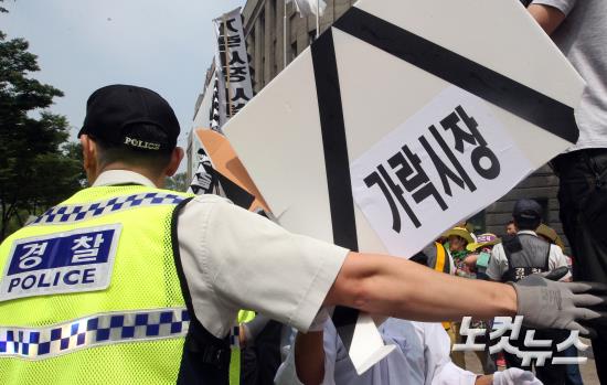 가락시장 청과물 상인들이 14일 오전 서울시청 앞에서 가락시장 현대화사업에 따른 강제이전에 반대하며 집회를 갖고 있다.