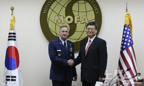 15일 오후 서울 종로구 외교부 청사에서 열린 제195차 SOFA 합동위원회에서 한미 양국 수석대표인 신재현 외교부 북미국장(오른쪽)과 테런스 오쇼너시 주한미군 부사령관이 악수를 하고 있다 . 이날 한-미 양국은 지난 4월 발생한 주한미군 탄저균 샘플 배달사고 등을 논의한다. (사진=윤성호 기자)