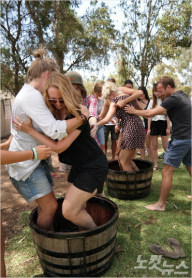 발을 깨끗이 씻은 후 나무통에 가득 담긴 포도알을 밟아가며 포도주스를 만드는 것은 색다른 재미이다.