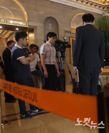 롯데그룹의 경영권을 둘러 싼 다툼의 끝이 보이지 않고 있는 31일 오후 서울 소공동 롯데호텔 신관 로비에서 취재진이 대기해 있다. 이 호텔 신관 34층에는 신격호 롯데그룹 총괄회장의 집무실이 위치해 있다.