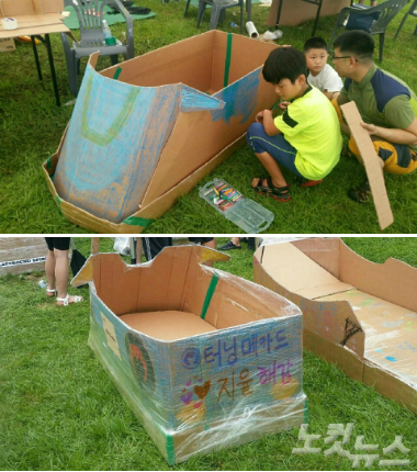 ◆ 전창원> 저희는 원래 큰 아이가 좋아하는 장난감 종류의 차를 만들려고 했는데요. 종이박스로, 둥근 모양같은 걸 표현하기에는 좀 제약이 있더라고요. 생각보다는 예쁘게 나오지는 않았지만 아이들도 너무 재미있어 했고요. 또 저도 처음으로 종이로 사람이 탈 수 있는 배를 만든다는 게 나름 재미있었던 것 같습니다.