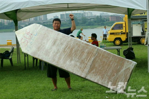 ◆ 전창원> 처음에는 좀 반신반의했습니다. 종이배가 물에 뜰 수도 있을 것 같기도 한데, 가라앉을 것 같단 생각도 했었고요. 만들고나서 사람이 타기 전에, 준비 작업 할 때 한번 띄워봤었는데, 뜨는 걸 보니까 자신감도 생겼고요. 완주 할 수 있겠다는 생각이 들더라고요.