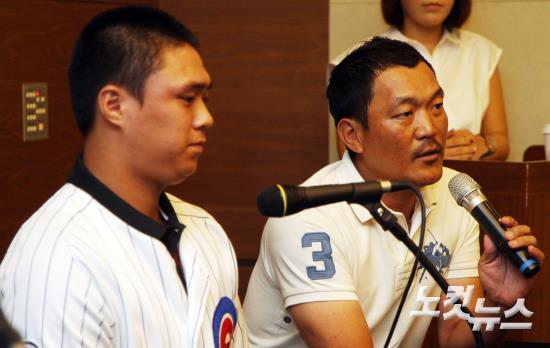 장충고 송민수 감독이 17일 오후 서울 영등포 코드야드 바이 메리어트 호텔에서 열린 장충고 외야수 권광민의 미국 메이저리그 시카고 컵스 입단 기자회견에서 취재진의 질문에 답하고 있다.